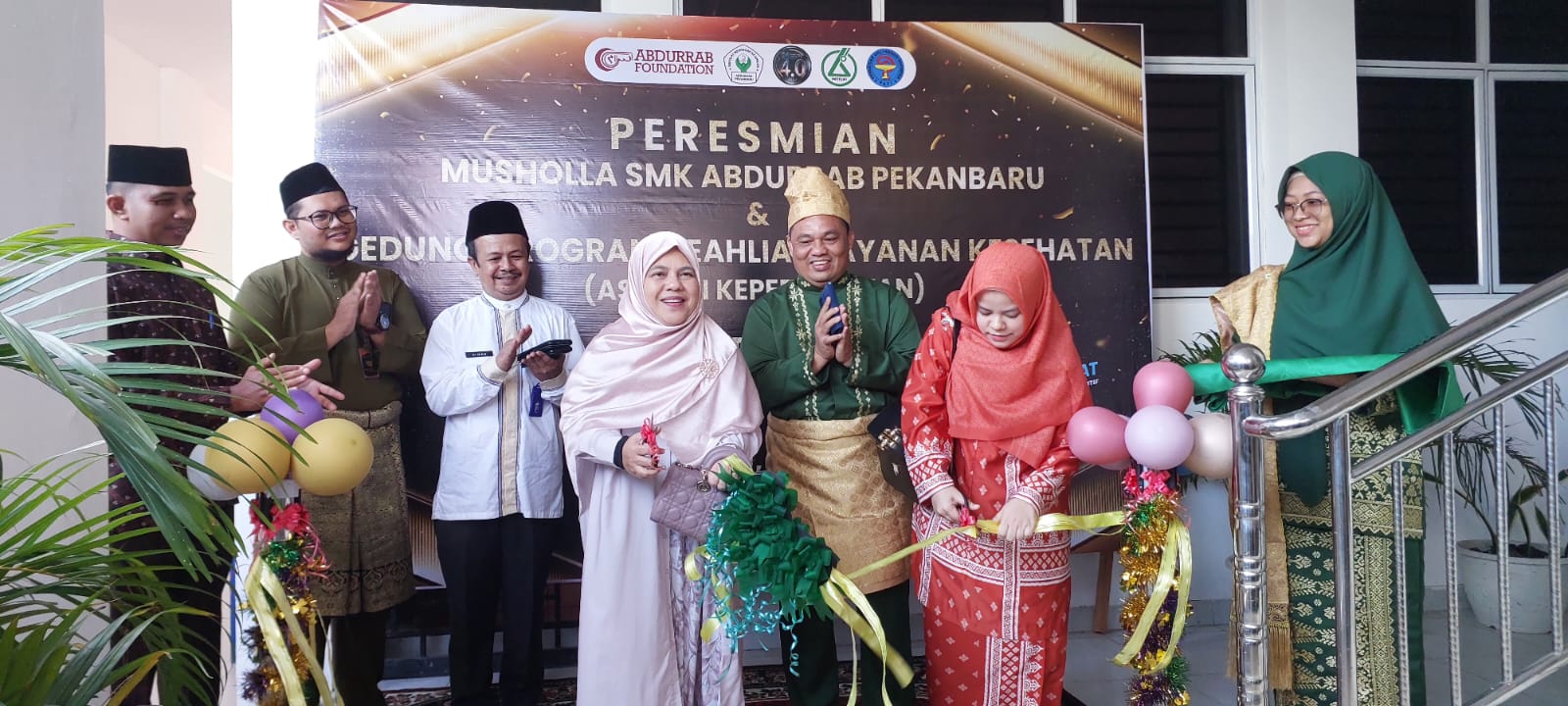 Riauterkini-PEKANBARU- Yayasan Abdurrab meresmikan penggunaan penggunaan Musala SMK Abdurrab dan Gedung Program Keahlian Layanan Kesehatan (Asisten Keperawatan) yang berlokasi di Jalan Delima Pekanbaru, Jumat (16/6/23). Peresmian secara simbolis dilakukan dengan pemotongan pita oleh Pembina Yayasan Abdurrab Dr dr Susiana Tabrani MPd dan Annisa Mutia Ruza AMd Akun serta disaksikan Kepala SMK Abdurrab Pekanbaru Irham Siregar SPd MSi, Pengawas dari Disdik Riau, Alman MPd, Direktur Abdurrab Islamic School, Muhammad Syauli Perdana Putra MPd serta majelis guru SMK Abdurrab.