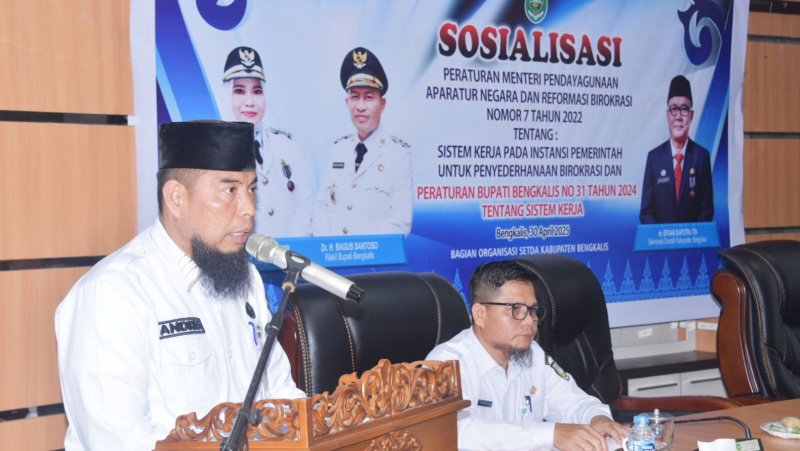 Riauterkini-BENGKALIS- Guna mewujudkan birokrasi yang ramping dan kaya fungsi, Pemerintah Kabupaten Bengkalis mensosialisasikan Peraturan Menteri Pendayagunaan Aparatur Negara dan Reformasi Birokrasi (Menpan-RB), Nomor 7 tahun 2022, tentang Sistem Kerja pada Instansi Pemerintah untuk Penyederhanaan Birokrasi.