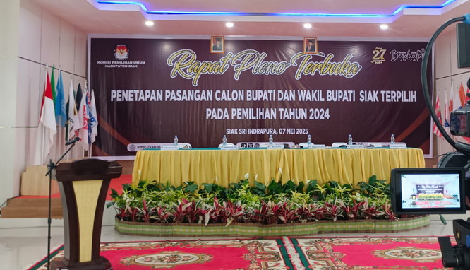 Riauterkini-SIAK - Komisi Pemilihan Umum (KPU) Siak, pagi ini menggelar rapat pleno terbuka penetapan pasangan Afni Z-Syamsurizal sebagai calon bupati dan wakil bupati Siak terpilih, pada pemilihan tahun 2024, Rabu (7/5/25).