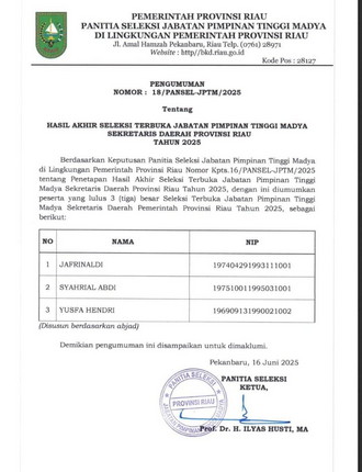 Tiga Nama Calon Sekda Riau Diumumkan, Ini Daftarnya