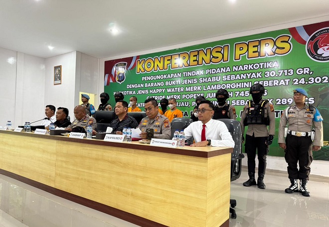 Kapolres merincikan hasil barang bukti yang berhasil disita diantaranya sebanyak 30.713,7 gram sabu dalam kemasan teh hijau “Chinese Tea”, 24.302,4 gram cairan Happy Water Lamborghini.