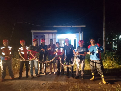 Damkar Inhil Evakuasi Ular Sanca 4,5 Meter di Permukiman Warga Tembilahan