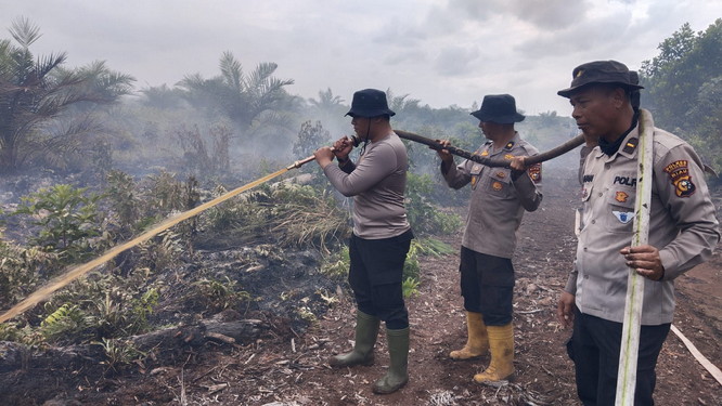 Personil Polsek Tanah Putih Turun Langsung Lakukan Pemadaman Lahan