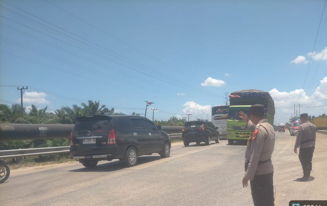 | Sabtu, 14 Maret 2026 Jaga Kelancaran Arus Mudik, Personel Pos Pam Rantau Bais Turun Atur Lalu Lintas