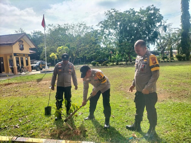 | Senin, 17 Nopember 2025 Dukung Pelestarian Lingkungan, Polsek Ukui Tanam Belasan Pohon Buah