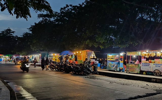 Di sini sejumlah pedagang kuliner berjejer di tepi jalan, sejak sore hingga malam hari. Makanan yang ditawarkan beragam, di antaranya siomai, cilok, gorengan, craffle, ketoprak, nasi goreng kambing, dan menu lainnya.