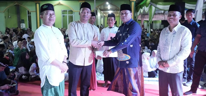 Riauterkini - TELUKKUANTAN - Bupati Kuantan Singingi, Dr. H. Suhardiman Amby, Ak. MM membantu panitia pelaksana salawatan Desa Marsawa, Kecamatan Sentajo Raya, serta anak yatim desa setempat, Sabtu (3/8/2024) malam.