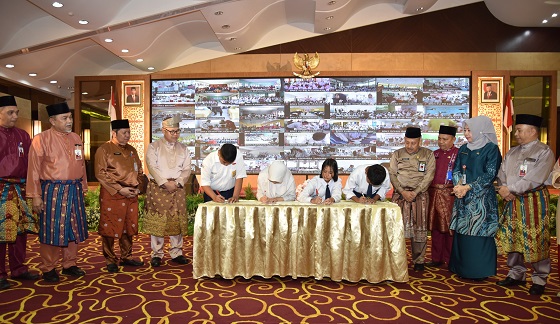 Acara tersebut digelar di kantor Pusat BRK Syariah Ballroom Menara Dang Merdu dan diikuti secara online dari 114 unit kantor BRK Syariahh Riau dan Kepri, Senin (5/8/2024) pagi. Perwakilan sekolah yang ada di Kota Pekanbaru mulai dari SD hingga SMP sederajat, mengirimkan pelajarnya untuk hadir mengikuti rangkaian acara tersebut dan ikut melakukan penandatangan pada buku Tabungan Simpel.