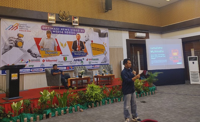 Narasumber kedua, Bayu Saputra, Video Specialist Riau Pos, mengungkapkan bahwa sumber traffic pembaca saat ini lebih banyak datang dari video di media sosial, bukan kunjungan langsung ke website.