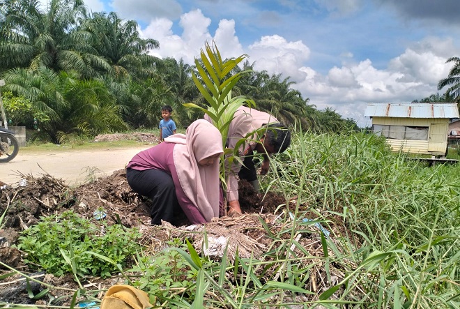 Selanjutnya, dilakukan penanaman pohon pinang secara bersama-sama oleh Penghulu Kepenghuluan Putat, Bhabinkamtibmas, serta ibu-ibu PKK sebagai bentuk sinergitas dan kepedulian terhadap kelestarian lingkungan.