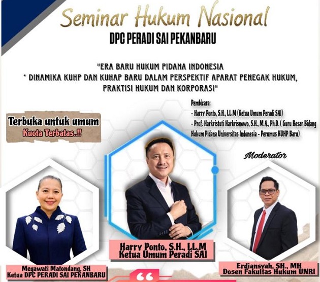 "Kegiatan seminar dimulai pukul 09.00 hingga pukul 14.00 WIB dengan pembicara Harry Ponto SH L.L.M yang juga Ketua Umum PERADI SAI dan Prof Dr Harkristuti Harkrisnowo SH MA Ph.D Guru Besar Hukum Pidana Universitas Indonesia dan juga perumus KUHP baru," ucap Doli Asmanto SH selaku Ketua Panitia Pelaksana seminar kepada riauterkini.com Jum'at (3/5/26)