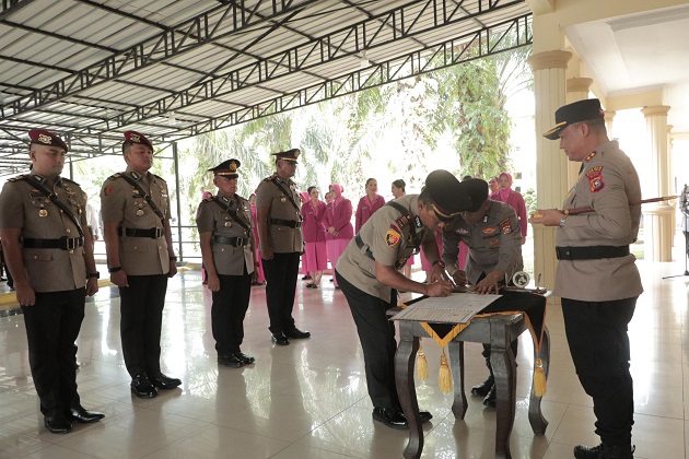 Riauterkini-TANAH PUTIH-Polres Rokan Hilir melaksanakan upacara Serah Terima Jabatan (Sertijab) sejumlah pejabat utama dan Kapolsek jajaran, Jumat (10/4/2026) sekira pukul 14.20 WIB di Selasar Mapolres Rokan Hilir.