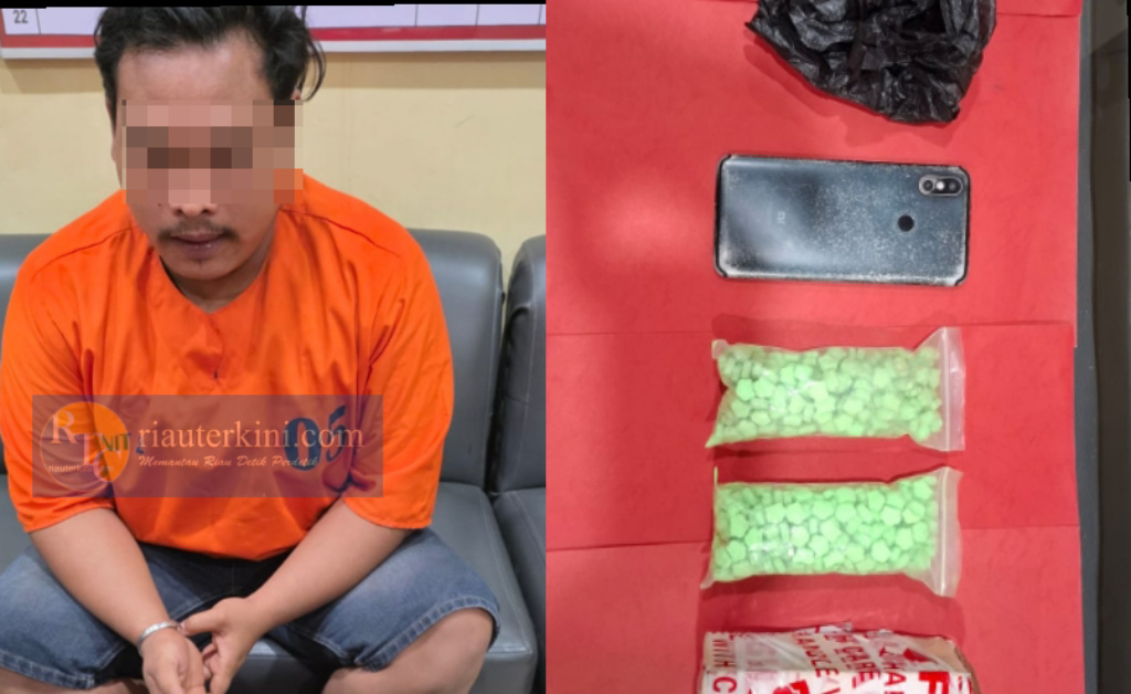 Penangkapan dilakukan sekitar pukul 00.30 WIB di tepi jalan kebun sawit, Jalan Garuda Sakti. Dari tangan tersangka, polisi mengamankan barang bukti berupa 500 butir pil ekstasi warna hijau merek “kodok” yang dikemas dalam dua bungkus plastik bening, beserta serbuk dan pecahannya.